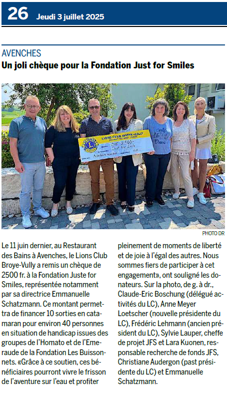 Le Journal de la Broye du 3 juillet 2025 a relayé la remise d’un chèque de 2’500 francs à Just for Smiles par le Lions Club Broye-Vully.